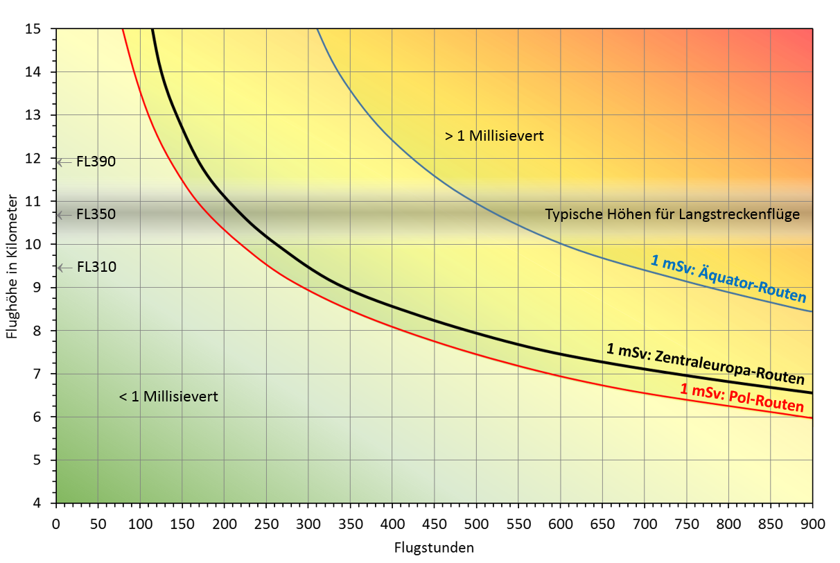 Abhängig von Flugprofil, Einsatzgebiet und jährlicher Flugzeit können effektive Jahresdosen im Bereich von 2 bis 6 mSv auftreten.